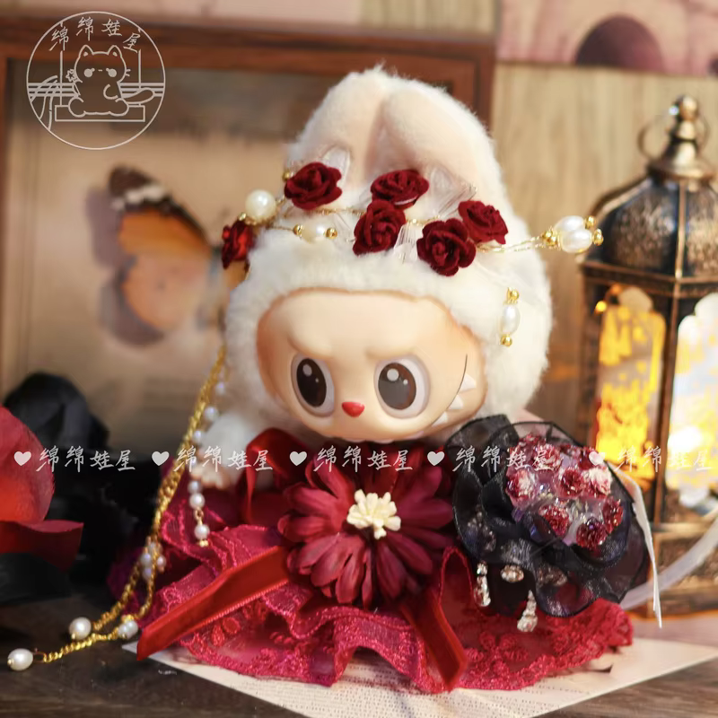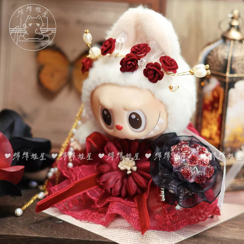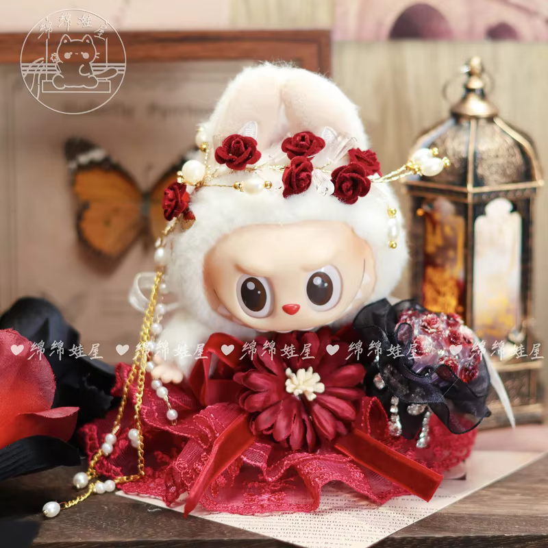 El set contiene prendas meticulosamente confeccionadas, incluyendo un llamativo vestido rojo adornado con intrincados embellecimientos florales, destinado a complementar muñecas de diferentes edades del universo Labubu. Aunque las muñecas no están incluidas, la ropa está hecha de materiales más suaves y de mayor calidad diseñados para vestir cualquier Labubu sin causar decoloración al peluche y al vinilo exterior. La presentación suspendida añadida también es visualmente atractiva para algunas de las fotografías creativas y disposiciones de exhibición.