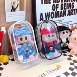 Estuche protector transparente en colores. Caja organizadora para muñecas Labubu V3 de 17 cm. Externo portafolio de exhibición con llavero. Muñeca accesorios