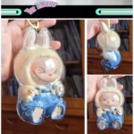 Juguete acrílico Labubu con una escalera de ensamblaje automático. Parte de un juego de juguetes Popmart, esta base a prueba de polvo ofrece almacenamiento óptimo para coleccionistas meticulosos