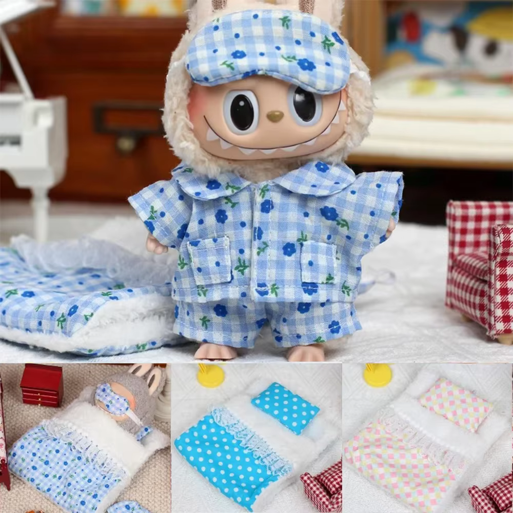 Mini complementos para muñecas de 17 cm para la muñeca Labubu Pop, 3 piezas/juego de cama, edredón y almohada, pijama, saco de dormir, obsequio para el hogar de muñecas, juguetes para niños.