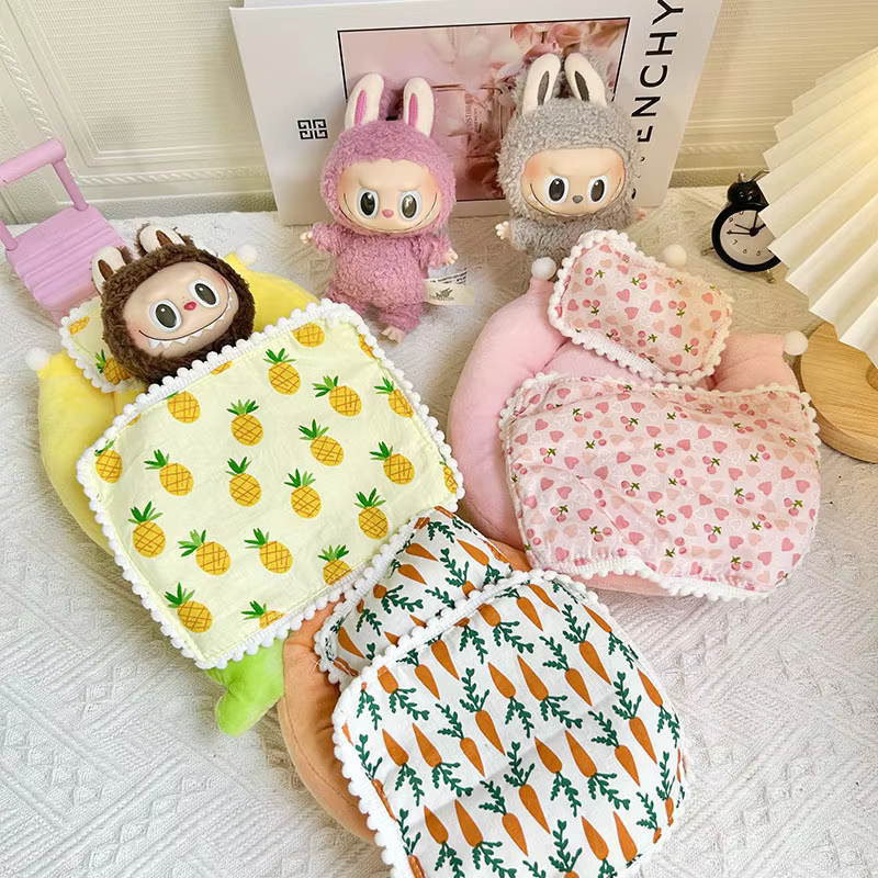 Ropa de cama para muñecas de algodón 2024, 10CM, lindo mini edredón, almohada, mascarilla para los ojos, Labubu, cama individual, conjunto de 3 piezas sin muñeca