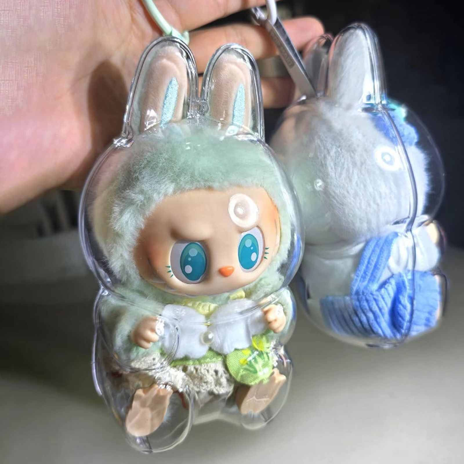El diseño combina la estructura suspendida con un sólido estuche transparente, manteniendo la figurita a salvo del polvo, los rayos del sol y caídas, mientras permite total visibilidad desde cualquier punto de vista. Ya sea guardada en una mochila, exhibida en un pedestal o sostenida, tu Labubu está pristine y siempre será el centro de atención.