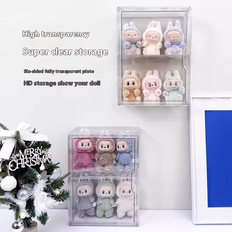 July 18, 2025Labubu, vitrina de acrílico, gabinete para muñecas Zimomo con tela removible, organizador de juguetes tipo caja ciega, organizador de juguetes.