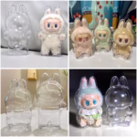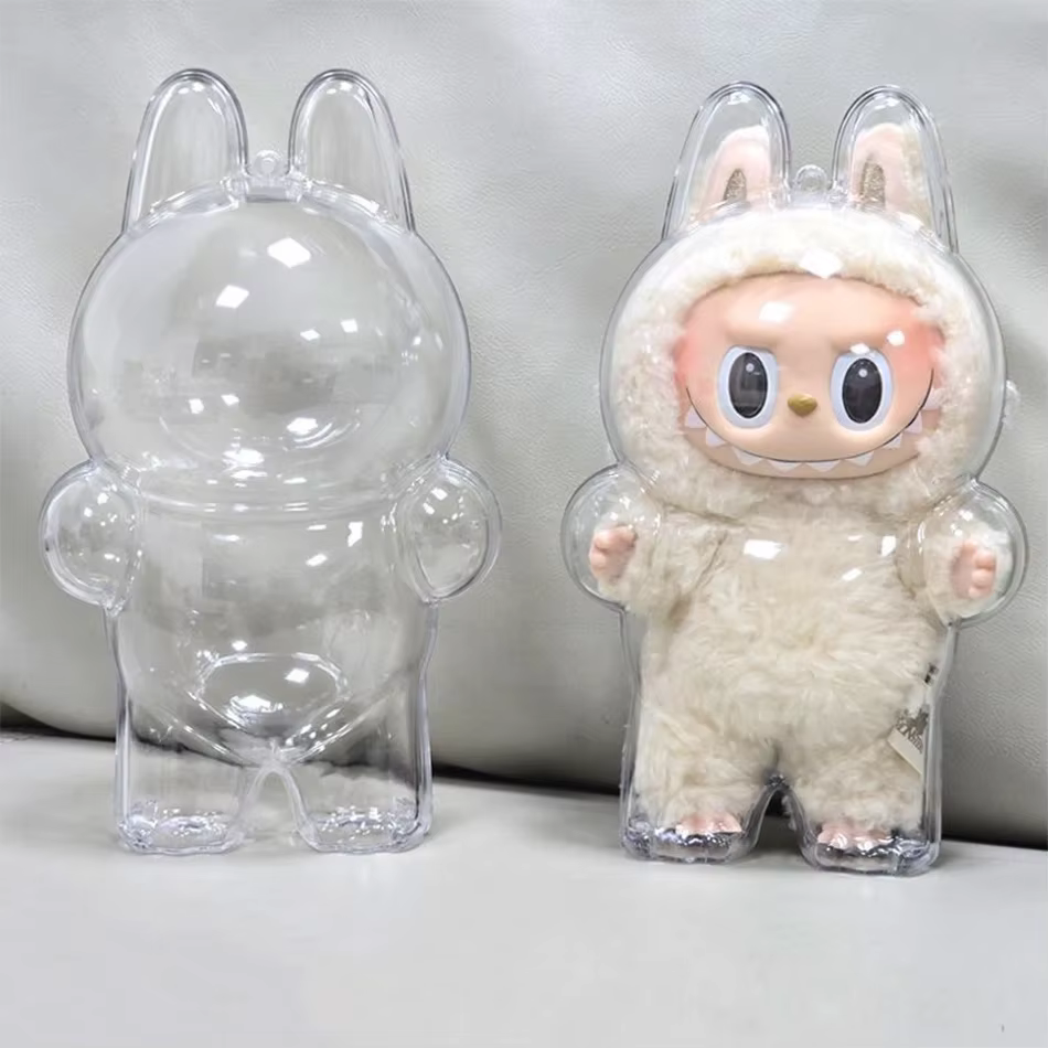 Juguete acrílico Labubu con una escalera de ensamblaje automático. Parte de un juego de juguetes Popmart, esta base a prueba de polvo ofrece almacenamiento óptimo para coleccionistas meticulosos
