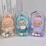 Estuche protector transparente en colores. Caja organizadora para muñecas Labubu V3 de 17 cm. Externo portafolio de exhibición con llavero. Muñeca accesorios